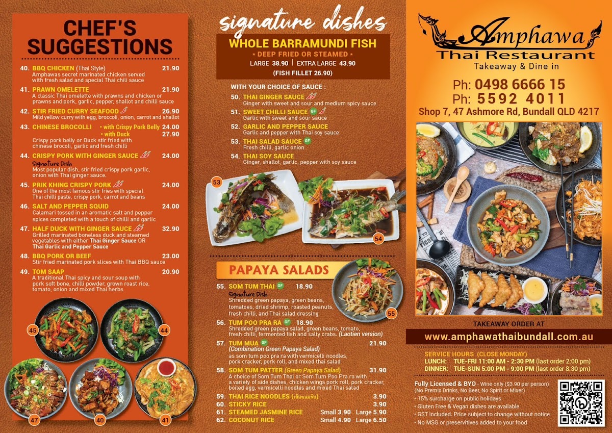 Welcome to Amphawa Thai Restaurant, a hidden gem nestled at Shop 7/47 Ashmore Rd, Bundall QLD 4217, Australia. If you’re seeking an authentic taste of Thailand that transports your palate straight to Southeast Asia, this is the place to be. With a vibrant ambience and a menu bursting with flavors, Amphawa promises culinary delights that are truly unforgettable.
